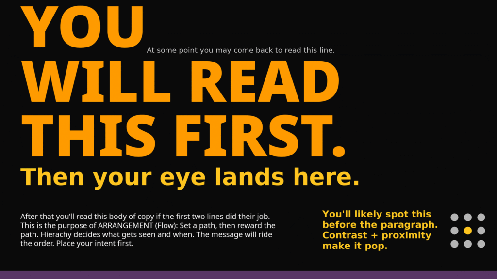 If everything shouts, nothing is heard. Contrast is how you control the soundproof room. Light vs. dark, big vs. small, smooth vs. gritty. It’s the hook that stops the scroll and says, “Look here first. then there.”